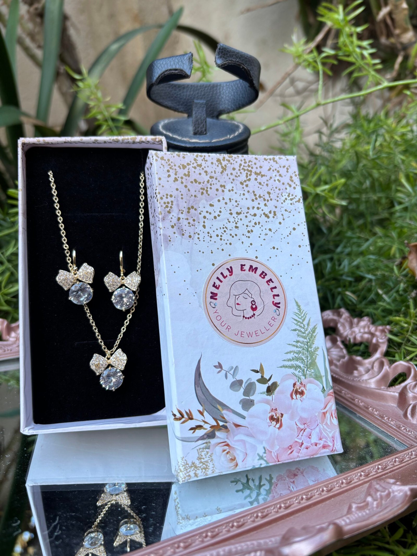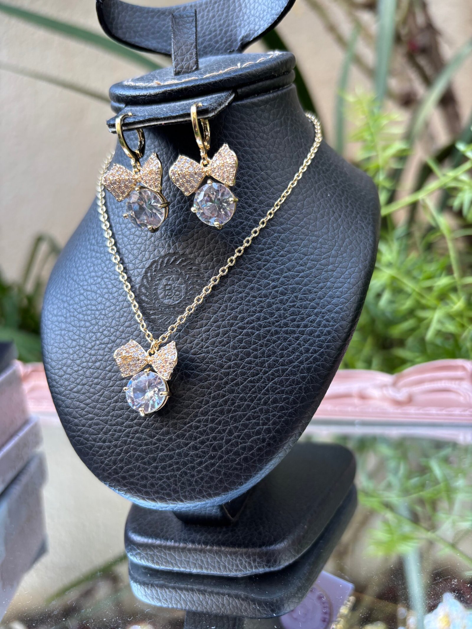 Ensemble élégant composé d’un collier et de boucles d’oreilles au nœud scintillant, conçue en acier chirurgical 316L plaqué or.